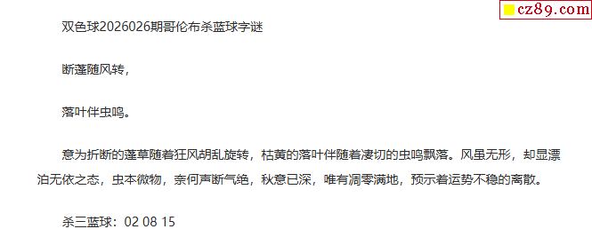 > 26年福彩双色球026期 哥伦布一句杀蓝球字谜