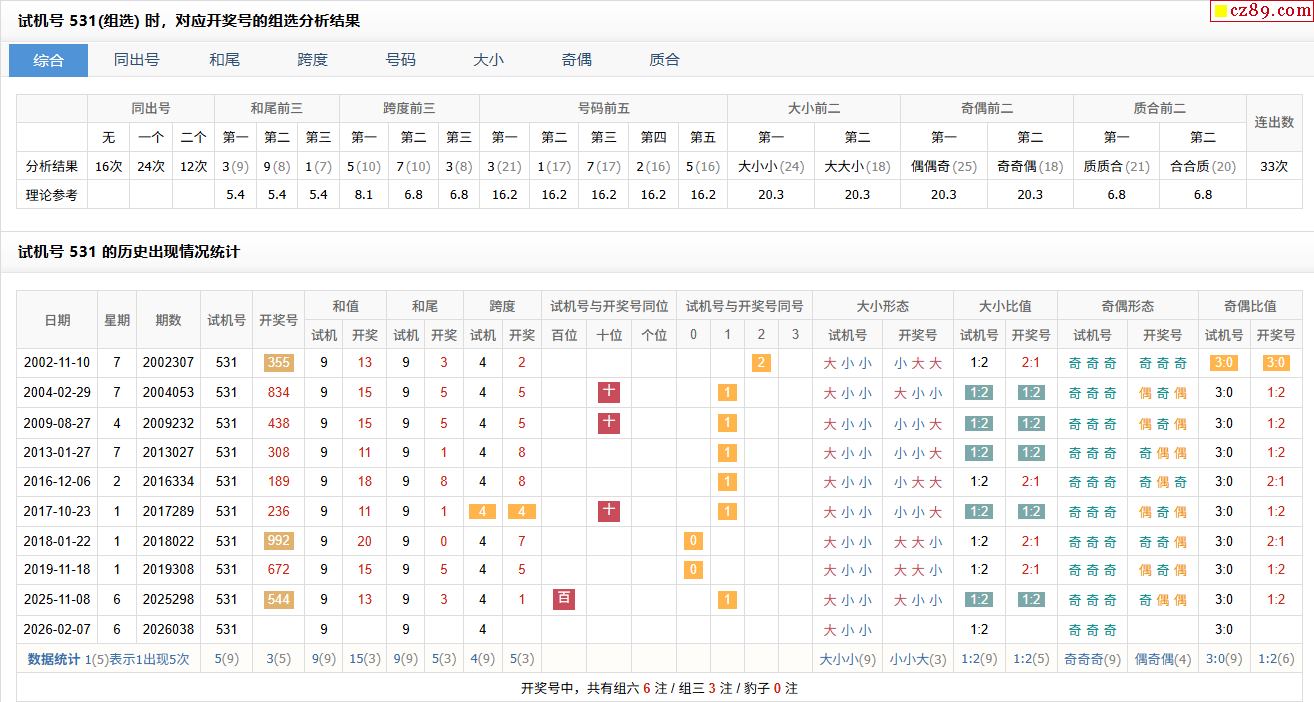 > 038期福彩3D试机号531对应开奖号的组选分析结果